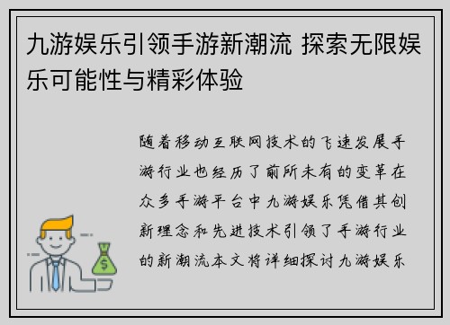 本文旨在探讨壹号娱乐如何通过创新发展,引领娱乐产业的未来,打造全新娱乐生态平台。文章将从四个主要方面进行详细阐述:第一,壹号娱乐在数字化技术和创新模式上的应用;第二,壹号娱乐如何推动娱乐内容的多元化与创意化;第三,壹号娱乐如何加强用户互动和体验感,提升平台的综合竞争力;第四,壹号娱乐如何构建可持续发...